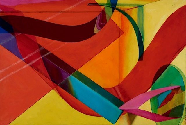 Although the paintings are formal compositions, they evoke futuristic cities, outer space, and science fiction settings. Surface flatness and the illusion of depth coexist simultaneously, creating spaces where the interplay and fusion of saturated colors, abstract shapes and imagination magically coexist.