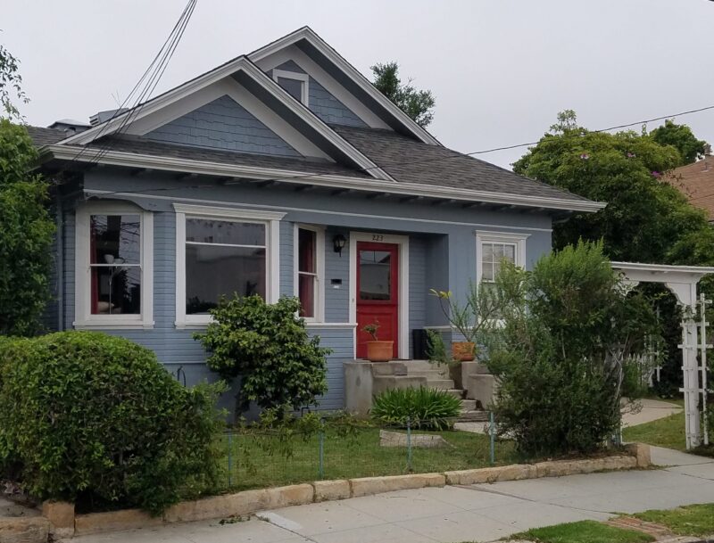 The home at 223 East Victoria Street was built during a time period when Queen Anne–style cottages were gradually being replaced by Craftsman-style bungalows. Its large bay window in the living room and charming leafy cutouts in the trim under the eaves are features that hark back to the Victorian era.