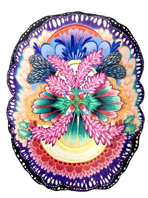 Portals is a solo exhibition that brings together various works from three different threads of Sommer Roman’s larger body of work: new textile-based wall sculptures and “Brain Scan” colored pencil drawings are paired with “Cell Portrait” ink drawings. This grouping of work sheds light on themes and forms that appear and reappear in Roman’s work repeatedly: namely, the biological cross-section and the circle.