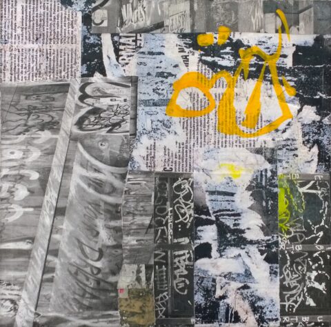 Industrial Strength connotes “extremely powerful, intense, durable, more concentrated than the standard brand.” In Garrett’s recent work, protests and prayers are woven into multiple layers of hand-painted papers. They also include stenciling, reduction techniques, and torn images from her archive, 30 years in the making, of street photography focused on chaotic urban environments. Demolished walls, raw graffiti, and gritty patterns all make their way into Industrial Strength.