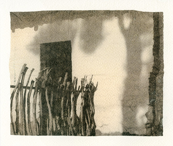 In the Santa Barbara series, Homage, Yerkes combines two photographic techniques that reinforce her personal responses to her subject matter: “lith” printing and emulsion transfer. Lith printing requires an extra-long exposure of the negative, and 15 minutes, or longer, in a highly dilute lithographic developer (a high-contrast developer formerly used for line drawings). Yerkes selected a special paper, Agfa, for this series, which is no longer produced, because it softens and warms the images, while adding some grittiness.