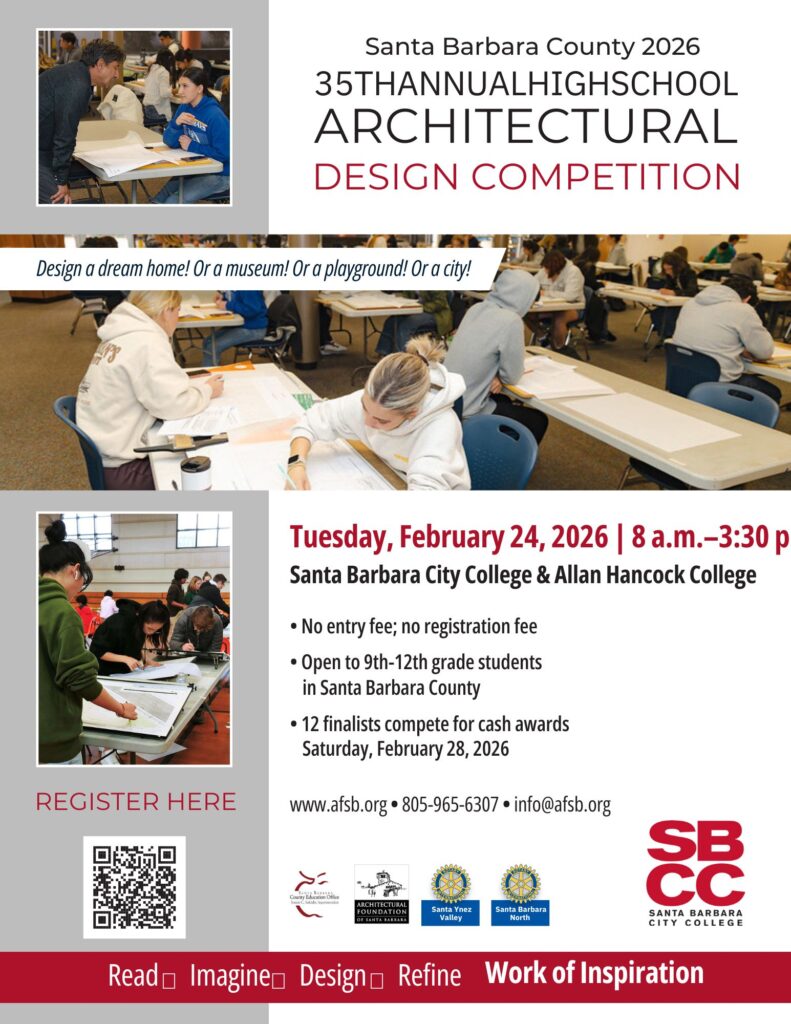 This year, the 2026 High School Architectural Design Competition will take place on Tuesday, February 24th at two different Charrette locations: the North County Charrette will be held at Allan Hancock College in Santa Maria and the South County Charrette will be held at Santa Barbara City College, Room TBD. Please select the charrette location that is closest to your school when you sign up.