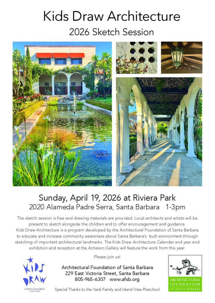 We hope you can join us this year for the 39th annual Kids Draw Architecture sketch session! It will be held at the Casa de la Guerra on Sunday, May 18th from 1 -3 p.m. This is a FREE event, and all sketching materials are provided.